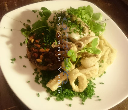 Served here with squid, roast shallot, black bean medlay and cavolo nero, you may also opt for samphire or seaweed.